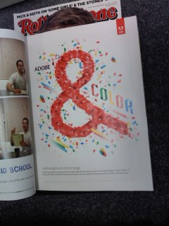 This is an Abobe ad in a CYMK graphic designer book. I noticed how they used their symbol (the triangles) and repeated them throughout the & symbol, and throughout the page. The & symbol is all red where as the rest of the page is colorful. They even have the word color made up of their triangle logo. The word adobe is in regular print. They also have some information at the bottom of the page.
